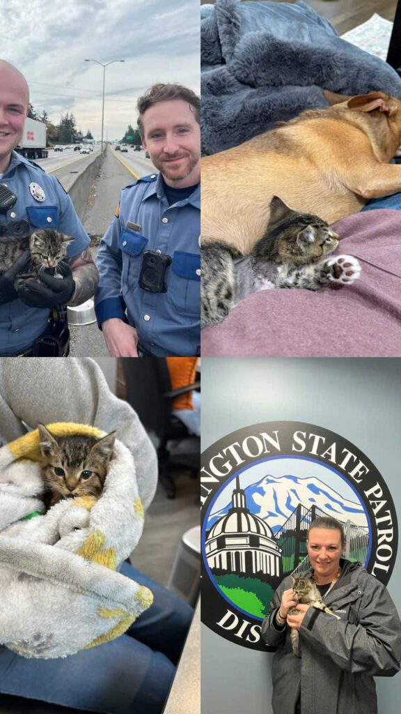 Last week, two compassionate troopers from the Washington State Patrol made an unexpected rescue along Interstate 5 in Pierce County. 🛣️ Amid the rush of cars and trucks, they spotted a tiny, frightened kitten huddled dangerously close to traffic. Without hesitation, they pulled over, gently scooped her up, and brought her to safety. 🙏